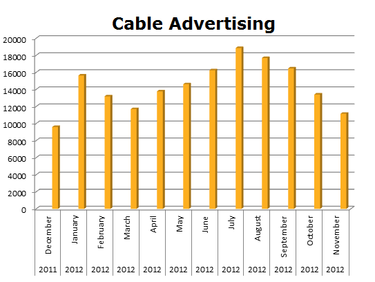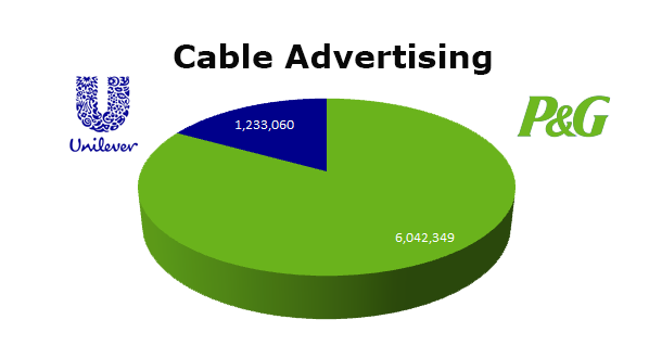 This can only be described as a heavy-weight fight in marketing. Procter and Gamble ran 6,042,349 spots in the last 12 months on Local Cable. Unilever ran 1,233,060 commercials on cable in the same period. Unilever’s biggest month was April 2012 when they cleared 138,160 spots, while P&G had their biggest month in October with 617,011 spots.