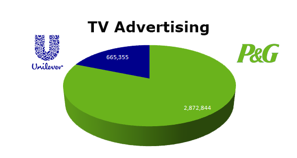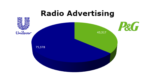 On the Radio, the game was a bit less intense. Unilever ran 75,378 spots against P&G’s 43,317 spots. P&G’s biggest month was April with 5,077 spots, while Unilever ran hottest in October with 14,467 ads.