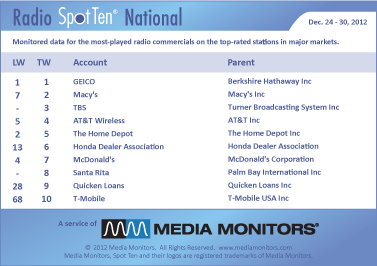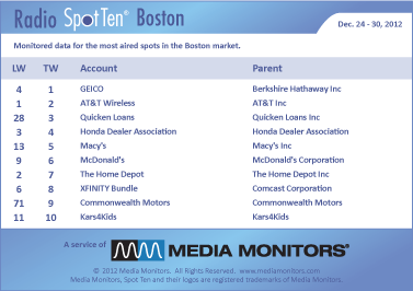 For the final week of the year in Boston for 2012 the #1 advertiser on the radio was GEICO with 855 spots. Coming in #2 was AT&T WIRELESS with 600 ads, while QUICKEN LOANS jumped from #28 to #3 with 536 spots. HONDA DEALER ASSOCIATION landed in #4 with 520 spots and MACY’S was #5 running 458 commercials. MCDONALD’S was #6 with 449 spots, while THE HOME DEPOT secured #7 with 432 ads. The XFINITY BUNDLE was #8 with 375 spots and COMMONWEALTH MOTORS moved from #71 up to #9 airing 372 spots. #10 was held by KARS4KIDS with 357 announcements.