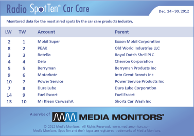 In this category the #1 national radio ad runner was MOBIL SUPER with 2,459 ads. PEAK peaked at #2 with 913 spots, while ROTELLA was solid at #3 airing 702 spots. DELO was #4 running 580 spots and BERRYMAN stayed at #5 with 525 spots. MOTORKOTE captured #6 with 365 spots, while POWER SERVICE secured #7 airing 361 ads. DURA LUBE landed in #8 with 203 commercials and FUEL ESCORT moved from #14 to #9 with 177 ads. Coming in #10 was MR KLEAN CARWASH with 132 spots.