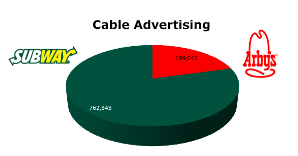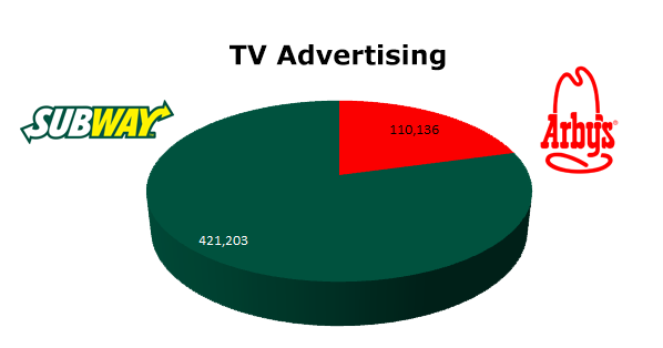 On Broadcast TV, Subway ran 421,203 spots in the last 12 months, while Arby's ran 110,136 spots in the same period. Subway's biggest month on TV was July with 54,241 and Arby's beefed up in April 2012 with 10,300 spots.
