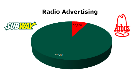 On the Radio, Subway dominated with 679,583 spots to Arby's 56,966 ads in the last 12 months. Subway's biggest month was July with 80,072, while Arby's biggest month was June with 7,277 spots.