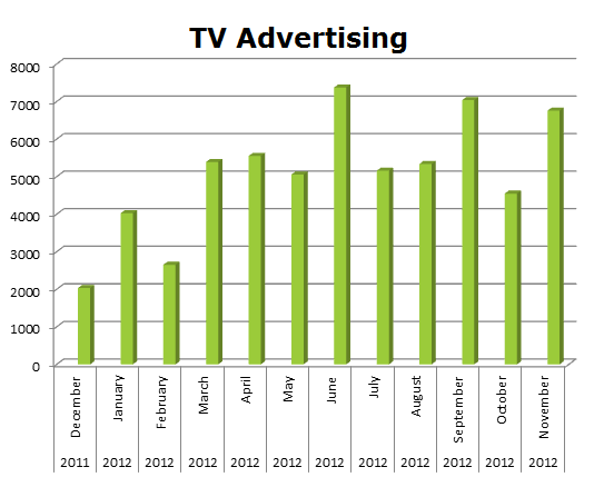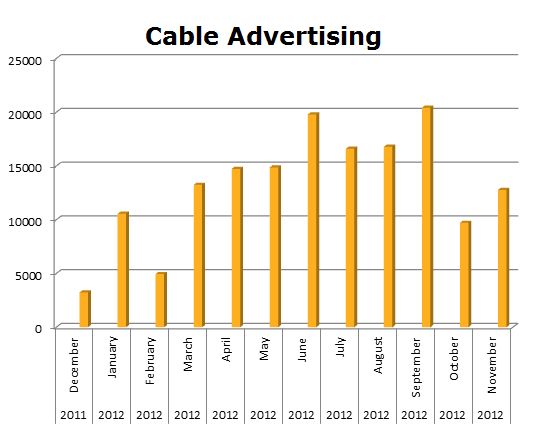 On Local Cable, Aflac ran 157,680 spots in the last 12 months. Their biggest month was September 2012 with 20,426 spots.