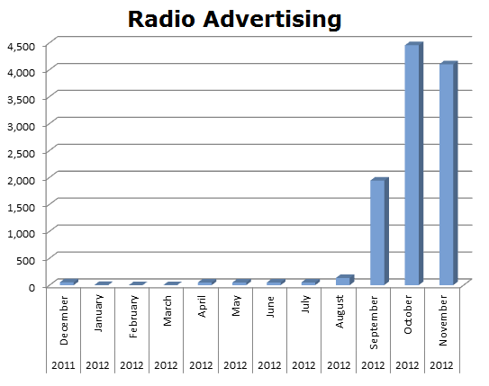 On Radio, Aflac seemed to be a sleeping duck until September. In all, they ran only 10,887 spots on the radio in the last 12 months. October was their biggest month with 4,453 spots.