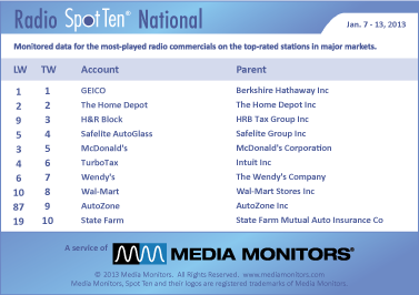 GEICO remains on top with 60,956 spots. THE HOME DEPOT in #2 ran 39,936 spots, while H&R BLOCK pushed their services up to #3 airing 36,056 ads. SAFELITE AUTOGLASS grabbed #4 with 30,391 spots and MCDONALD’S was #5 with 28,277 spots.