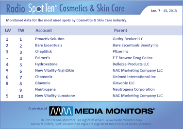 In this category, the #1 advertiser on radio in the nation was PROACTIV SOLUTION with 7,414 spots. BARE ESCENTUALS stayed at #2 with 4,560 spots, while CHAPSTICK was stuck at #3 with 3,660 ads. PALMER’S took #4 with 2,117 spots and HYDROXATONE was #5 running 1,682 spots. NEW VITALITY-NIGHTSKIN was #6 with 522 commercials, while CHAMONIX was #7 airing 138 spots. GIAVONIE stayed at #8 with 71 spots and NEUTROGENA was #9 with 62 spots. NEW VITALITY-LUMATONE fell from #5 to #10 last week with 44 spots.