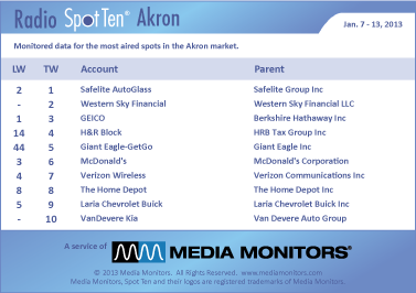 In Akron, the #1 radio advertiser in the rubber city was SAFELITE AUTOGLASS with 270 spots. WESTERN SKY FINANCIAL was #2 airing 224 announcements, while GEICO landed in #3 with 223 ads. H&R BLOCK make their January push taking #4, up from #14 and running 182 spots. GIANT EAGLE-GETGO soared from #44 to #5 with 161 spots and MCDONALD’S was #6 with 157 spots. VERIZON WIRELESS was #7 with 143 ads, while THE HOME DEPOT was solid at #8 with 141 ads. LARIA CHEVROLET BUICK was #9 with 139 spots and VANDEVERE KIA was #10 with 138 spots.