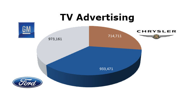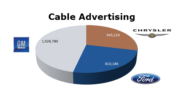 On Broadcast TV, GM had the edge with 973,161 spots last year compared to Ford’s 933,471 ads. Chrysler ran the least with 714,711 spots in 2012. GM ran hottest in December 2012 with 104,851 spots, while Ford ran the most in December as well at 95,735 commercials and Chrysler cleared the most in September at 72,202 spots.