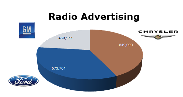 On the Radio, Chrysler tops the three with 849,090 spots in the last 12 months, while Ford was #2 with 673,764 spots in 2012. GM ran 458,177 spots last year. GM ran the most in June with 52,627 ads, while Ford was hottest in September with a grand total of 133,315 spots. Chrysler cleared 91,090 spots in August.