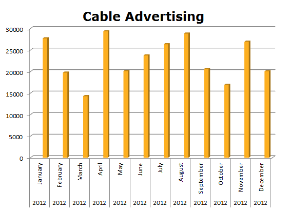 In the battle for dominance in the Big Three U.S. automakers, GM wielded a big stick in Local Cable with 1,526,780 spots last year. Chrysler was next with 945,226 and Ford was not far behind with 810,186 spots. GM’s ran hottest in December 2012 with 168,388 spots, while Chrysler ran hottest in October 2012 with 104,183 ads. Ford cleared the most spots in October as well with 86,711 spots.