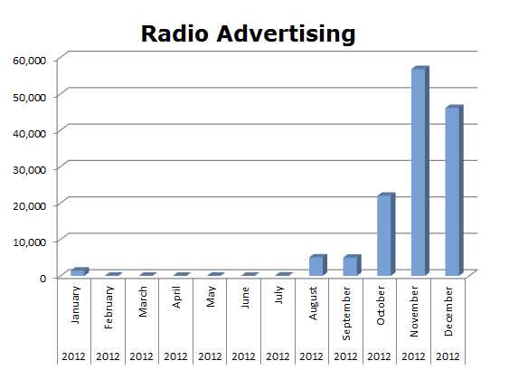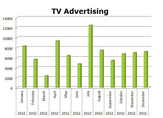 On the Radio, Discover started out a bit slow in 2012. They finally kicked in during the month of August with their biggest month being November when they ran 56,742 spots. For the whole year in 2012, they ran 136,638 spots.