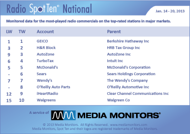 In the Twin Cities last week the #1 radio advertiser was MENARDS with 652 spots. Coming in #2 was the SHANE COMPANY with 498 spots, while H&R BLOCK captured #3 with 476 ads. GEICO was #4 running 468 commercials and WAL-MART marched into #5 with 454 spots. AUTOZONE zoomed from #23 to #6 with 410 spots, while CENTERPOINT ENERGY lit #7 with 387 spots. ZEROREZ (Cleaning Services) takes #8 with 368 ads and MCDONALD’S was #9 with 366 commercials. IHEARTRADIO comes in #10 with 341 spots.