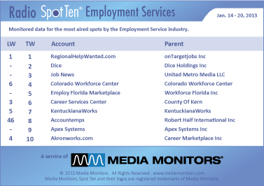 In the category of Employment Services, REGIONALHELPWANTED.COM was clearly #1 with 6,722 spots. DICE was #2 airing 609 announcements, while JOB NEWS nudged into #3 with 187 spots on the radio. COLORADO WORKFORCE CENTER took #4 with 122 spots and EMPLOY FLORIDA MARKETPLACE landed in #5 with 120 spots. CAREER SERVICES CENTER secured #6 with 116 spots, while KENTUCKIANAWORKS was #7 with 89 spots. ACCOUNTEMPS leaps from #46 to #8 with 88 spots and APEX SYSTEMS was #9 with 88 spots as well. AKRONWORKS.COM was #10 with 88 spots.