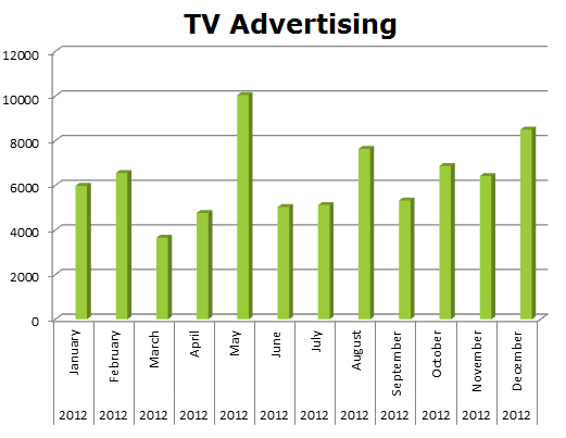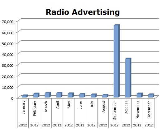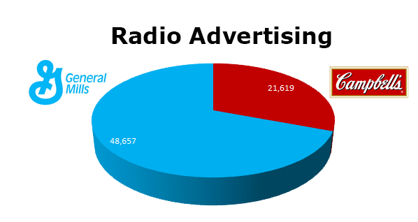 On the Radio, General Mills ran 48,657 spots against Campbell’s 21,619 spots last year. General Mills ran the most radio ads in October 2012 with 6,904 and Campbell’s cooked in February with 10,158 spots. On Radio, Campbell’s brands aired 44.43% as many spots as General Mills.