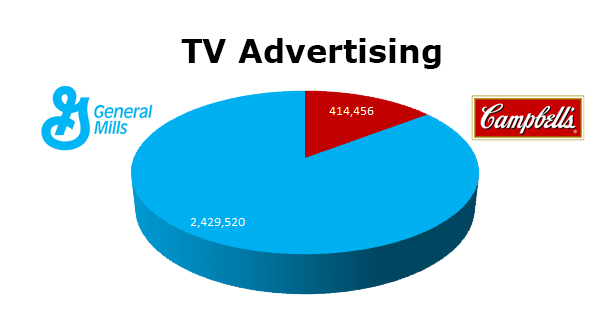 On Broadcast TV, General Mills steamed ahead with 2,429,520 spots, while Campbell’s cleared 414,456 spots last year. General Mills ran the most spots last January with 285,663 spots, while Campbell’s was hottest in the same month, January 2012, airing 64,498 spots. On TV, Campbell’s brands aired 17.06% as many spots as General Mills brands.