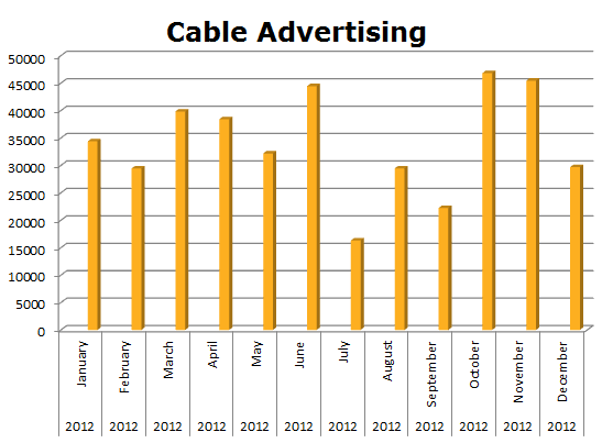 On Local Cable, General Mills ran 2,062,015 spots last year, while Campbell’s ran 815,405 ads in the same period. General Mills biggest month was October with 244,612 spots. Campbell’s hottest month was January 2012 with 109,521 ads. On Local Cable, Campbell’s brands aired 39.54% as many spots as General Mills.