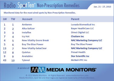 #1 in this category in the country was AMBEREN with 12,177 spots. ALKA-SELTZER was #2 airing 6,936 announcements, while INSTAFLEX was solid at #3 running 6,477 spots. ICY HOT got hot from #7 to #4 with 3,984 ads and NEW VITALITY – SNORE BREAK made some noise at #5 with 3,891 spots. BUY THE BLUE POWER was #6 with 3,021 spots, while NEW VITALITY-SEBACLEAR soared from #13 to #7 airing 1,778 spots. QUIETUS moved quietly from #12 to #8 with 1,763 spots and ANATABLOC was solid at #9 running 1,737 ads. TYLENOL took #10, up from #43, with 1,650 spots.