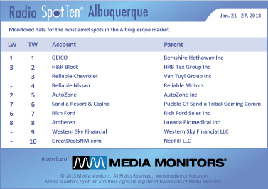 Last week the #1 advertiser was GEICO with 1,044 spots. H&R BLOCK pushes into #2 with 700 spots, while RELIABLE CHEVROLET took #3 with 541 spots. RELIABLE NISSAN was #4 running 528 ads and AUTOZONE moved down to #5 with 506 spots. SANDIA RESORT & CASINO was #6 with 448 spots and RICH FORD found #7 with 447 commercials. AMBEREN was #8 airing 440 ads and WESTERN SKY FINANCIAL was #9 with 425 spots. GREATDEALSNM.COM was #10 with 410 spots.