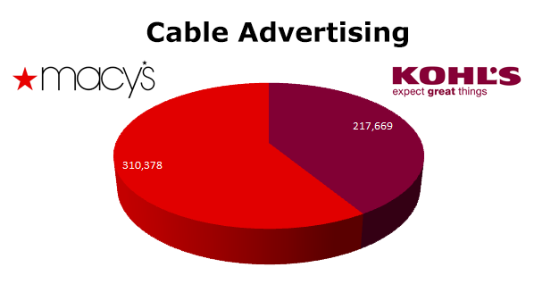 On Local Cable, Macy’s ran 310,378 spots against Kohl’s 217,669 ads last year. Macy’s biggest month was November with 56,793 spots, while Kohl’s also ran hottest in November with 57,910 spots.