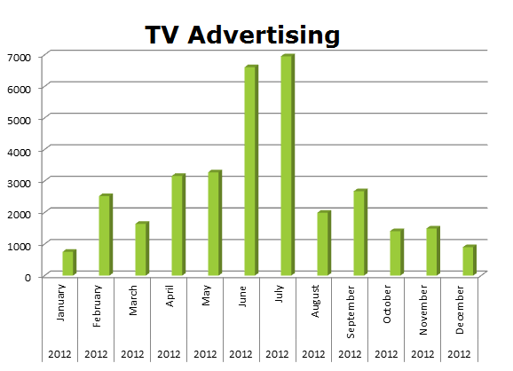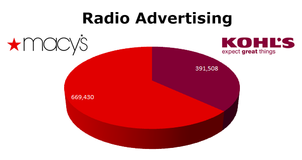 On the Radio, Macy’s ran 669,430 spots last year, while Kohl’s cleared 391,508 spots in 2012. Macy’s biggest month was December when they ran 111,777 holiday spots, while Kohl’s biggest month was August with 53,176 spots.
