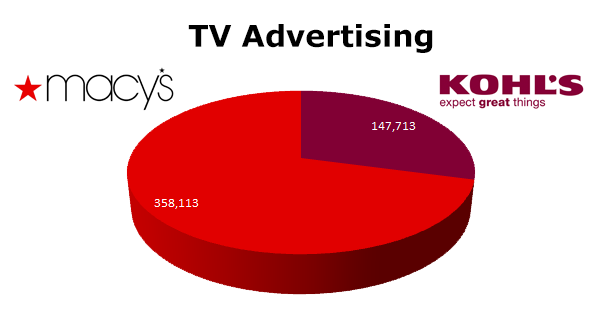 On Broadcast TV, Macy’s ran 358,113 ads against Kohl’s 147,713 spots last year. Kohl’s biggest month was November with 27,198 spots and Macy’s ran hot in both November (54,981) and December (54,240).