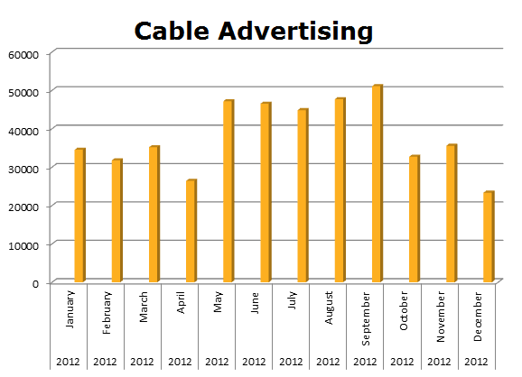 On Local Cable, Frits Lay ran 457,114 spots last year with their biggest month being September with 51,117 ads. 65% of all their spots on the three media ran on Cable.
