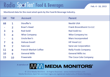 In the Food & Beverage category, we had STOUFFER’S on top with 3,934 spots. BOAR’S HEAD sliced their way into #2 with 3,395 ads, while RED GOLD got #3 with 1,471 spots. The WISE COMPANY perched at #4 with 976 commercials and UNCLE BEN’S was #5 with 783 spots. HELUVA GOOD! landed at #6 with 764 spots, while SARA LEE was #7 airing 613 spots. FRENCH MARKET COFFEE perked at #8 with 525 ads and GENERAL MILLS marched into #9 with 512 spots. POWERADE was #10 with 345 spots.
