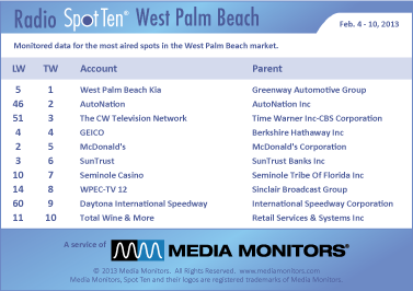 In WPB last week the #1 radio advertiser was WEST PALM BEACH KIA with 619 spots. AUTONATION flew from #46 to #2 airing 577 ads, while THE CW NETWORK soared from #51 to #3 with 397 spots. GEICO was steady at #4 with 379 commercials and MCDONALD’S was #5 with 375 spots. SUNTRUST seized #6 with 374 spots, while SEMINOLE CASINO rolled #7 with 327 ads. WPEC-TV 12 landed at #8 with 291 ads and the DAYTONA INTERNATIONAL SPEEDWAY zoomed into #9 from back in the pack at #60 by running 289 spots. TOTAL WINE & MORE popped the cork on #10 airing 272 spots.