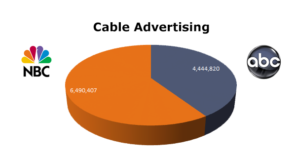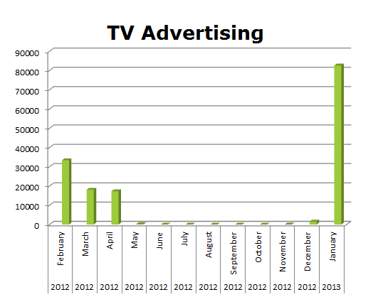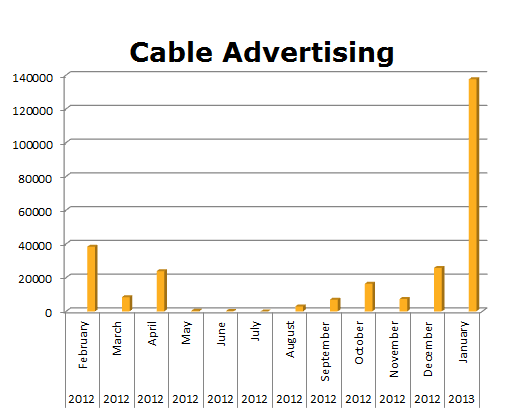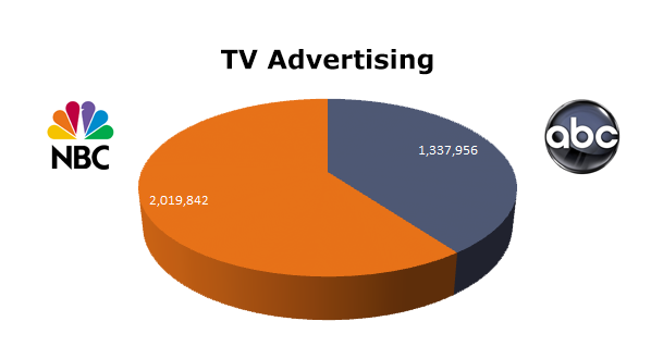 On the Broadcast TV side, NBC ran 2,019,842 spots, while ABC ran 1,337,956 ads in the last 12 months. NBC TV ran the most in January 2013 with 180,073 spots and ABC TV ran the most in May 2012 with 122,190 spots.