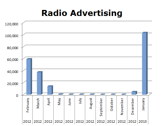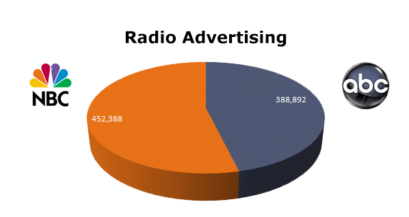 On the Radio, NBC TV edged out ABC slightly with 452,388 spots in the last 12 months. ABC ran 388,892 ads in the same period. NBC’s biggest month was October of 2012 when they cleared 59,486 spots, while ABC ran hottest in September of last year with 66,944 spots.