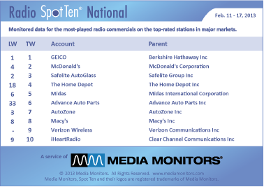 Last week, the #1 radio advertiser in the nation was once again GEICO with 48,149 spots. #2 was MCDONALD’S with 29,275 ads, while SAFELITE AUTOGLASS was #3 with 28,134 ads. THE HOME DEPOT leaped from #18 up to #4 airing 26,456 spots and MIDAS took over #5 with 23,634 spots.
