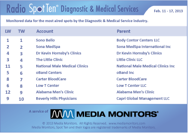In the category of Diagnostic Medical Services, the #1 radio advertiser in the nation last week was SONO BELLO with 1,703 spots. Coming in #2 was SONA MEDSPA with 1,346 spots, while DR. KEVIN HORNSBY’S CLINICS clocked in at #3 with 1,074 spots. THE LITTLE CLINIC was big at #4 with 699 ads and NATIONAL MALE MEDICAL CLINICS claimed #5 running 445 commercials. The OBAND CENTERS seized #6 with 413 spots and CARTER BLOODCARE was #7 with 332 spots. LOW T CENTER was #8 with 332 spots as well, while ALABAMA MEN’S CLINIC checked into #9 airing 305 spots. And #10 was the BEVERLY HILLS PHYSICIANS with 303 spots.