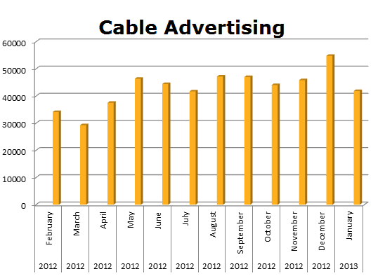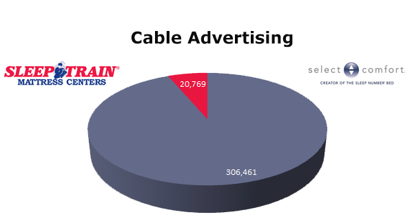 On Local Cable, Sleep Train ran 6.78% of the ads that Select Comfort ran in the last 12 months. To be exact, Sleep Train ran 20,769 spots, while Select Comfort cleared 306,461 spots. Selector Comfort’s biggest month was February 2012 when they ran 43,503 spots, while Sleep Train’s biggest thrust was in August 2012 with 3,113 spots.