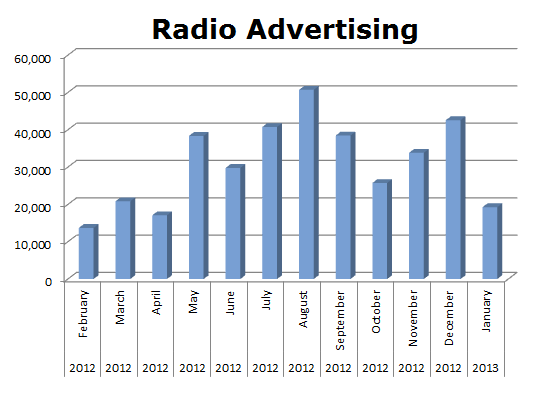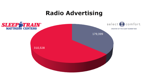 On the Radio, Sleep Train ran 310,328 spots in the last 12 months, while Select Comfort had 179,399 spots. The biggest radio month for Sleep Train was January 2013 with 30,013 spots. Sleep Train consistently averaged around 25,000 spots for every month in 2012. Select Comfort ran hottest in August 2012 with 21,696 ads. They too, were fairly consistent month to month in 2012.