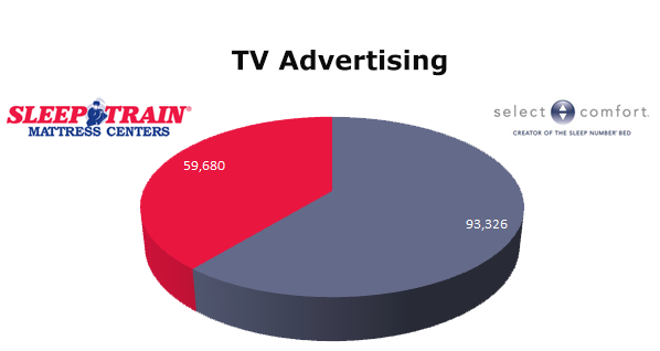 On Broadcast TV, Sleep Train ran around 63.95% as many spots at Select Comfort. Sleep Train cleared 59,680 spots in the last 12 months, while Select Comfort ran 93,326 spots in the same period. Sleep Train’s hottest TV months were August with 7,246 spots and January 2012 with 7,354 ads. Select Comfort’s biggest month was March 2012 with 12,382 spots.
