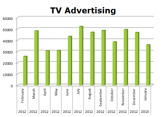 On Broadcast TV, Nissan cleared 496,055 spots in the last 12 months with the large monthly buy happening in July 2012 with 52,043 spots.