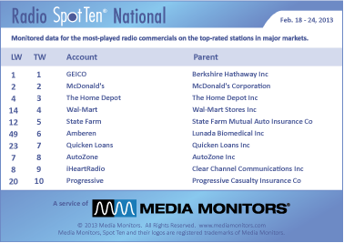 GEICO kept their major push with 58,955 spots making them #1 once again. MCDONALD’S stayed at #2 with 28,181 ads, while THE HOME DEPOT crept back into #3 with 27,024 spots. WAL-MART surged from #14 up to #4 with 22,332 commercials and STATE FARM captured #5 airing 21,301 spots.