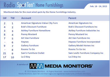 In this category last week, the #1 advertiser was AMERICAN SIGNATURE-VALUE CITY FURNITURE with 1,803 spots. BOB’S DISCOUNT FURNITURE sat down at #2 with 1,529 spots, while ASHLEY FURNITURE HOMESTORE was solid at #3 airing 1,118 ads. PENNY MUSTARD landed at #4 with 698 spots and ART VAN FURNITURE found #5 with 629 spots. HAYNES was #6 with 464 spots, while GALLERY FURNITURE was #7 airing 406 commercials. ROOMS TO GO got as high as #8 with 386 spots and SAM’S FURNITURE OUTLET zoomed from #21 to #9 with 329 spots. LA-Z-BOY relaxed at #10 with 323 spots.