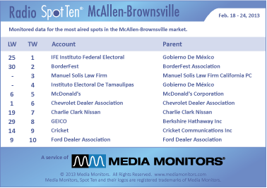 The #1 advertiser in McAllen-Brownsville last week was IFE INSTITUTO FEDERAL ELECTORAL (Mexican Unions) with 831 spots. BORDERFEST was #2 airing 620 ads, while MANUEL SOLIS LAW FIRM was on the docket at #3 with 368 spots. INSTITUTO ELECTORAL DE TAMALIPAS (Mexican Government) was #4 with 360 ads. MCDONALD’S was #5 with 352 commercials, while the CHEVROLET DEALER ASSOCIATION dropped from #1 to #6 last week clearing 351 spots. CHARLIE CLARK NISSAN nudged into #7 from #19 with 347 ads and GEICO was #8 with 284 spots. CRICKET hopped into #9 from #14 with 266 ads, while the FORD DEALER ASSOCIATION took #10 with 264 spots.