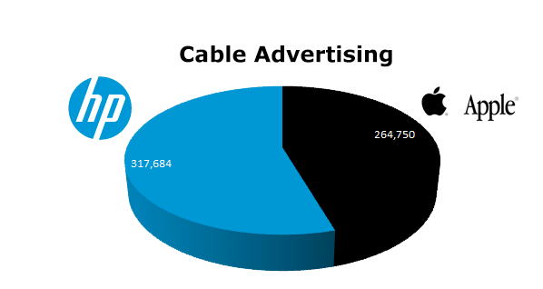 On Local Cable, HP and Apple are running neck to neck. HP ran 317,684 spots, while Apple 264,750 ads. Apple’s biggest month was August 2012 when they ran 32,652 ads and HP ran hottest in August 2012 as well with 83,537 ads.