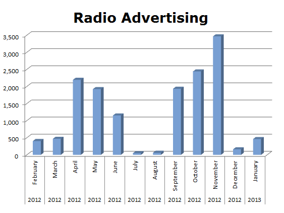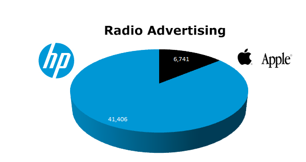 On the radio, HP was out ahead of Apple, but even their 12 month spot count was limited. HP ran 41,406 ads in the last 12 months, while Apple only appeared 6,741 in the same period. HP’s biggest monthly count appeared in December 2012 with 11,437 spots, while Apple ran the most radio in February 2012 at 3,789 spots.