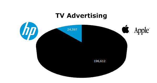 On Broadcast TV, Apple clearly is the leader with 196,612 spots in the last 12 months, while HP cleared 24,397 spots. HP ran the most TV in August 2012 with 5,572 spots and Apple was hottest in October 2012 with 21,335 ads.