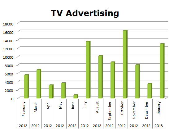 On Broadcast TV, Sara Lee ran 92,939 commercials in the last 12 months with their peak coming in October 2012 with 16,218 spots.
