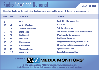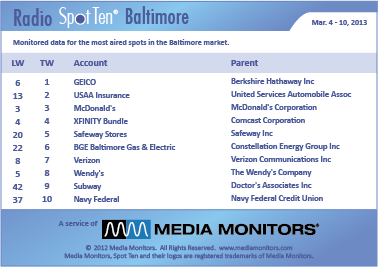 In Baltimore last week the #1 radio advertiser was GEICO airing 835 spots. USAA INSURANCE soared from #13 to #2 with 557 ads, while MCDONALD’S stayed at #3 with 468 commercials. XFINITY BUNDLE was solid at #4 with 410 spots and SAFEWAY STORES zipped from #20 to #5 with 401 spots. BGE BALTIMORE GAS & ELECTRIC juiced from #22 to #6 with 389 spots, while VERIZON landed at #7 airing 385 ads. WENDY’S was #8 running 381 spots and SUBWAY poured it on from #42 to #9 with 366 spots. NAVY FEDERAL docked at #10 with 323 spots.