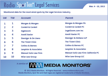 In the world of law suits and legal matters, more and more law firms are taking to the airwaves to find clients. Last week in the country the #1 legal advertiser on radio was MORGAN & MORGAN with 4,977 spots. CORDELL & CORDELL was #2 again with 1,895 ads, while LEGALZOOM (The web site) is solid at #3 running 1,690 spots. ANELI XAVIER was #4 with 1,055 spots and DANZIGER & DE LLANO landed at #5 with 986 spots. THE TICKET CLINIC captured #6 with 865 spots, while CELLINO & BARNES stayed at #7 with 817 spots. LANPHIER & ASSOCIATES ran 678 spots making them #8 and MANUEL SOLIS LAW FRIM took #9 with 628 spots. The WISE LAW grabbed #10 with 496 spots.