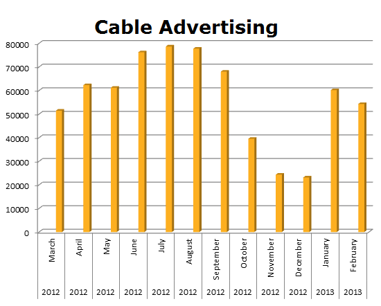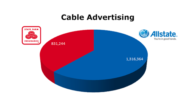 On Local Cable TV, Allstate ran 1,316,364 spots against State Farm’s 831,244 ads. State Farm’s biggest month was January 2013 when they cleared 146,781 ads, while Allstate ran the most in March of 2012 when they cleared 156,971 spots.
