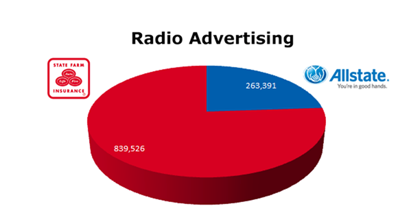 On the Radio, State Farm was way out in front with 839,526 spots, while All State ran 263,391 spots. The biggest month for State Farm was February 2013 with 83,193 and Allstate ran hottest in March 2012 with 46,903 ads.