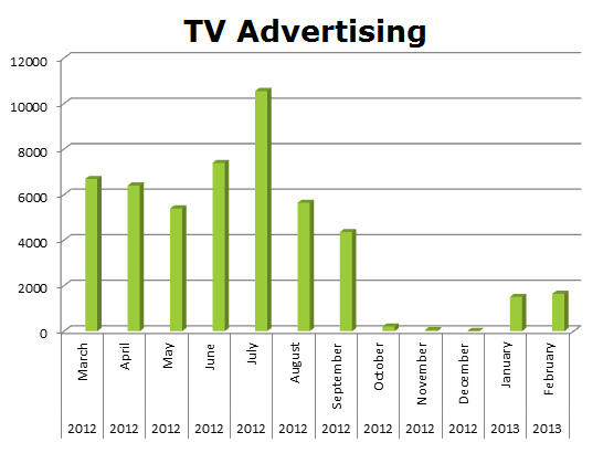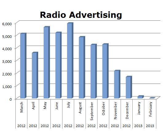 On the Radio, Angie's List cleared 49,831 spots in the last 12 months but has had a slow start this year so far. Their hottest month was July 2012 when they ran 5,936 spots.