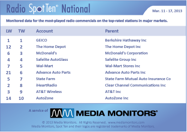 On the national level, GEICO stayed at #1 with 45,175 spots. THE HOME DEPOT came back from #12 to #2 with 35,699 spots. MCDONALD’S moved from #6 up to #3 with 29,333 ads, while SAFELITE AUTOGLASS was solid at #4 with 25,225 spots. WAL-MART is back in the top five with 24,965 spots.