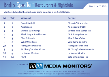 Today, we feature Restaurants and Nightclubs on the radio from last week. #1 advertiser was BONEFISH GRILL with 5,124 spots. APPLEBEE’S locked into #2 with 2,283 ads, while BUFFALO WILD WINGS dropped from #1 to #3 with 1,293 ads. BLACK ANGUS STEAKHOUSE was solid at #4 with 828 commercials and MAX & ERMA’S stayed at #5 with 742 spots. WILD WING CAFÉ landed at #6 with 682 spots. FLANAGAN’S IRSH PUB promoted St. Patrick’s Day with 662 spots, which put them in lucky #7. PF CHANG’S CHINA BISTRO remained at #8 airing 625 spots and LA NUEVA MOVIDA soared from #32 to #9 with 591 spots. FATZ was #10 with 562 spots.
